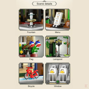 Das Gebäude kann liebevoll dekoriert werden, mit einem Brunnen, einer Menükarte, der französischen Flagge, einer Straßenlaterne, einem Fahrrad und kunstvollen Fenstern.