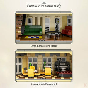 Das Gebäude besteht aus zwei Haushälften und kann aufgeklappt werden. Beide Seiten sind mit viel Zubehör dekoriert, wie Pflanzen, einem Fahrrad, einem Außenbereich zum Sitzen und einem Brunnen.