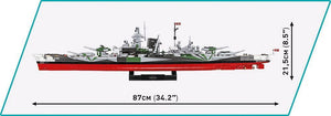 Das von der Firma COBI erstellte Schiffsmodell wurde im Maßstab 1:300 produziert. Es hat fast 3.000 Elemente und ist 84,5 cm lang. Dank der Verwendung der neuesten verfügbaren Elemente und fortschrittlicher Konstruktionstechniken spiegelt das Modell die Proportionen des historischen Schiffes originalgetreu wider und behält alle wesentlichen Elemente bei, einschließlich der ursprünglichen, sehr charakteristischen Tarnung. Es verfügt über zahlreiche bewegliche Teile wie Propeller, Ruder, drehbare Türme und Kanonenrohre, die angehoben und abgesenkt werden können. Unter dem abnehmbaren Teil des Decks haben wir Zugang zum Motorraum. Das Set enthält auch einen sehr stabilen und ästhetischen schwarzen Ständer mit einer Platte, auf der der Name des Schiffes aufgedruckt ist. Da es sich um ein großes und recht komplexes Modell handelt, empfehlen wir es vor allem erfahrenen Sammlern und älteren, erfahrenen Bausteinfans. Es muss nicht geklebt oder bemalt werden, da sein gesamter Körper und seine Elemente aus COBI-Bausteinen bestehen.