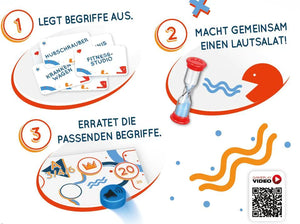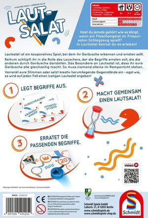 Lautsalat ist ein kooperatives Spiel. Gemeinsam versucht ihr, den Lautsprecher auf der dunkelblauen Tonspur ins Ziel zu bringen. Ihr spielt über mehrere Runden. In jeder Runde gibt es einen “Lauscher”. Die anderen Spielenden versuchen, jeweils einen Begriff durch Geräusche darzustellen. Der Clou dabei: Alle machen ihre Geräusche gleichzeitig. Danach rät der Lauscher, welche der ausliegenden Begriffe in diesem Lautsalat dargestellt wurden.