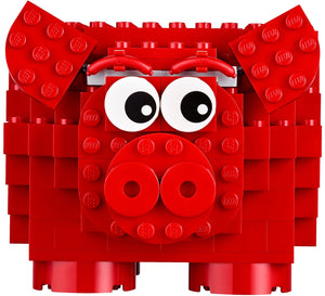 Spar dein Geld in dem Modell LEGO® Kultiges Sparschwein mit drehbaren Augen, beweglichen Ohren und Augenbrauen aus Würstchen-Steinen.Lass dein Kleingeld in das rote Schweinchen hineinfallen!
