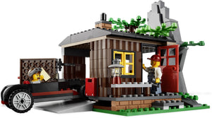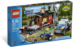Vom Dach seines Geheimverstecks im Wald erblickt einer der Räuber die Polizisten auf ihrem Geländewagen. Gelingt es den Räubern, die Goldbarren im roten Briefkasten zu verstecken und zu entkommen? Und haben sie schon den riesigen Bären entdeckt, der gerade um die Ecke geschlichen kommt? Enthält 4 Minifiguren: 2 Polizisten und 2 Räuber.