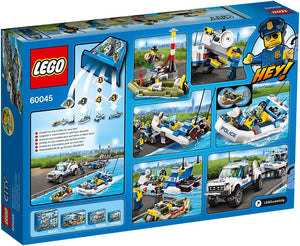 Enthält einen Polizei-Transporter mit Anhänger, Überwachungsstation, Polizei-Schlauchboot, Gauner-Schlauchboot und Leuchtturm-Unterschlupf des Gauners