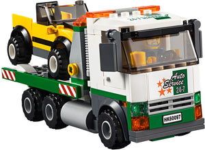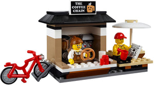Das Set enthält einen LEGO® Store, einen LEGO Lieferwagen, einen Helikopter, einen Autohändler, 3 Autos, einen Abschleppwagen, ein Fahrrad, einen Pizzaboten-Motorroller, eine Straßenbahnhaltestelle, einen Coffeeshop, einen Hotdog-Stand und einen Zeitungsstand.