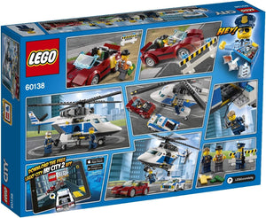 Hilf Chase McCain, dem LEGO® City Helden, den Ganoven zu verfolgen und ihm die Beute und den gestohlenen Sportwagen wieder abzunehmen. Das Set enthält auch einen Hubschrauber mit Seilwinde, einen Polizei-Verfolgungswagen und vier Minifiguren.