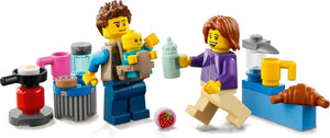 - Als Zubehör sind eine coole Babytrage für die Minifiguren, ein Campingkocher mit Pfanne, sowie ein Spiegelei und ein Croissant enthalten.