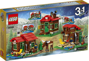 Viel Spaß in der Hütte am See, die ein Farbmuster aus Rot, Braun, Grün und Blau besitzt. Sie verfügt über einen Balkon, eine Wandlampe und eine detaillierte Einrichtung mit Herd, Bett und Tisch. Draußen befinden sich zudem ein Lagerfeuer, Seerosen, ein Platz zum Holzhacken sowie eine kleine Kiefer. Dieses 3-in-1-Modell aus der Produktlinie LEGO® Creator lässt sich in eine Beobachtungswarte oder ein kleines Blockhaus umbauen. Alle drei Modelle können ausgeklappt werden, um Zugang zum Innenraum zu bieten. Enthält eine männliche Minifigur sowie einen Elch und einen Frosch.