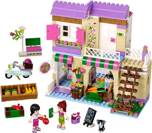 Im Heartlake Lebensmittelmarkt kannst du dir frische Lebensmittel aussuchen! Hilf Maya in ihrem Geschäft. Backe jeden Morgen frische Plätzchen, um sie den Kunden zu verkaufen. Sieh die Bestellungen durch, die am Computer eingehen, und setz dich auf den Motorroller, um die Kunden in ganz Heartlake City zu beliefern. Heute ist Mia zu euch ins Geschäft gekommen. Hilf ihr beim Aussuchen und Wiegen des Gemüses und bei der Auswahl von frischen Blumen, Säften, Milch und selbstgemachter Marmelade. Geh dann in Mayas Wohnung über dem Geschäft, um leckeren Kuchen und ein erfrischendes Getränk zu genießen. Am Ende des Tages schließt du die putzigen Fensterläden und lässt Mayas Katze herein, bevor Maya in ihrem Schlafzimmer im Dachgeschoss zu Bett geht. Enthält die Spielfiguren Mia und Maya sowie eine Katze.
