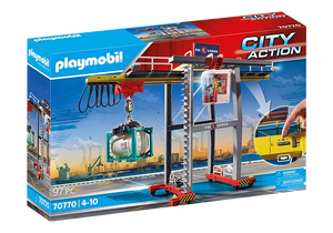 Elektrischer PLAYMOBIL-Portalkran zum schnellen Be- und Entladen von LKW oder Containerschiff. Mithilfe des eingebauten Motors können Container angehoben und von einer Seite zur anderen transportiert werden. (Für den Kran werden 3 x 1,5 V / R6 Mignon-Batterien benötigt)