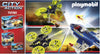 Für spannende Verfolgungsjagden in der Luft. Der Polizei-Jet verfolgt den mit einer innovativen Drohne flüchtigen Geldräuber. Ein cleverer Bösewicht hat sich eine Super-Drohne gebaut und macht nun die Stadt unsicher. Doch der Übeltäter hat nicht mit der Playmobil-Polizei und ihrem coolen Jet gerechnet. Im Handumdrehen springt der Pilot ins Cockpit und klappt Nase, Rumpf und Tragflächen des Flugzeugs aus. An der Unterseite der Tragflächen werden die Geschosse befestigt und schon geht es ab in die Luft. Doch was ist das? Kaum hat der Jet den Boden verlassen, schiesst auch schon ein Geschoss haarscharf am Cockpit vorbei. Der Pilot kann im letzten Moment ausweichen. Doch da nähert sich der Gauner schon wieder und die scharfen Sägezähne an den Rotorblättern der Drohne verfehlen den Jet nur um wenige Zentimeter. Eine spannende Verfolgungsjagd in der Luft beginnt. Das Spielset enthält zwei Playmobil-Figuren, einen ausklappbaren Polizei-Jet mit schussfähigen Kanonen, eine Drohne mit beweglichen Rotorblättern und Geschütz, Helme, Armcomputer und viele weitere Extras.