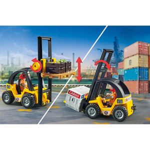 PLAYMOBIL Gabelstapler mit Fracht, Hubfunktion, Container und Schwerlastpalette.